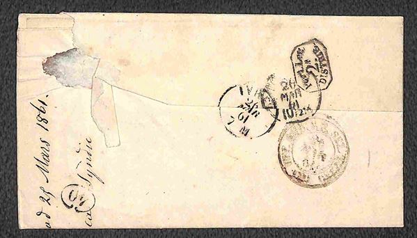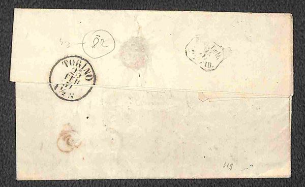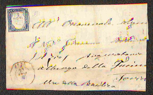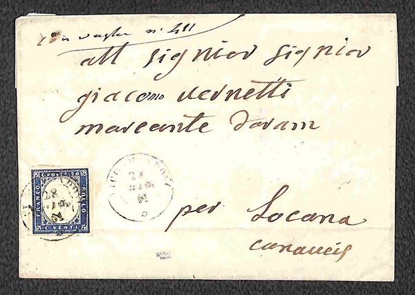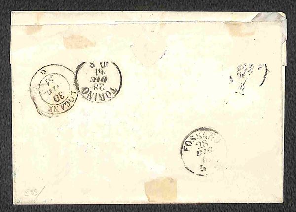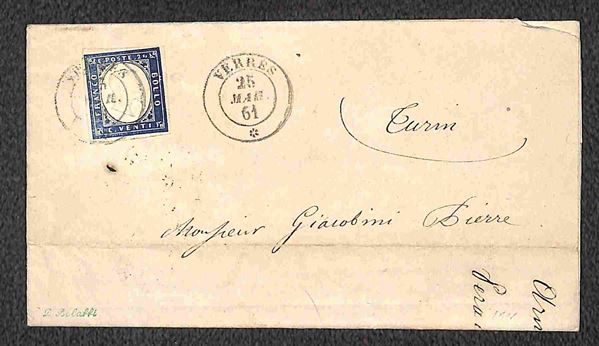 Lotto di tre lettere con annulli di SUSA, VERRES e VICO MONDOVI su Sardegna c.20 quarta emissione, tutte di bella qualità, una con firma A.D. e due con timbrini Bolaffi