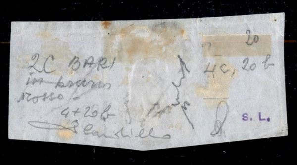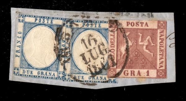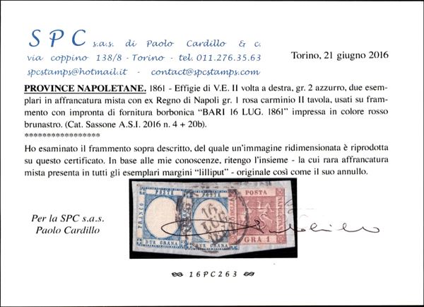 Piccolo frammento con Napoli gr.1 rosa chiaro + Province due esemplari gr.2 azzurro, annullo BARI 16 LUG.1861, cert. Cardillo