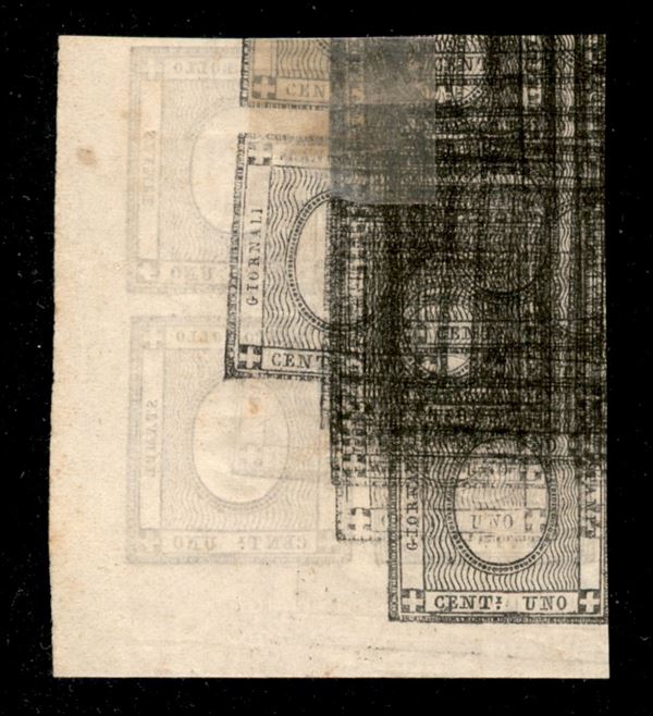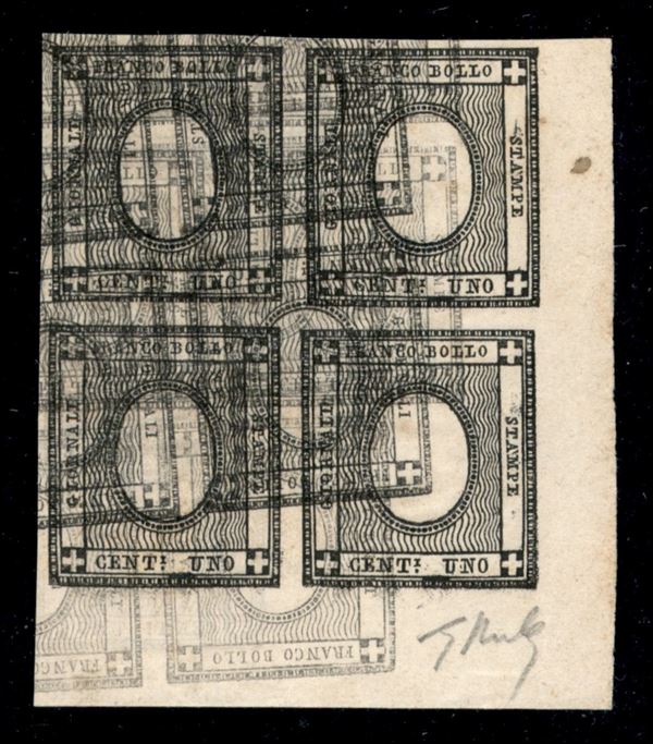 Prova di avviamento macchina, quartina c.1 grigio nero (19) con stampa multipla sul recto ed anche al verso, nuova senza gomma