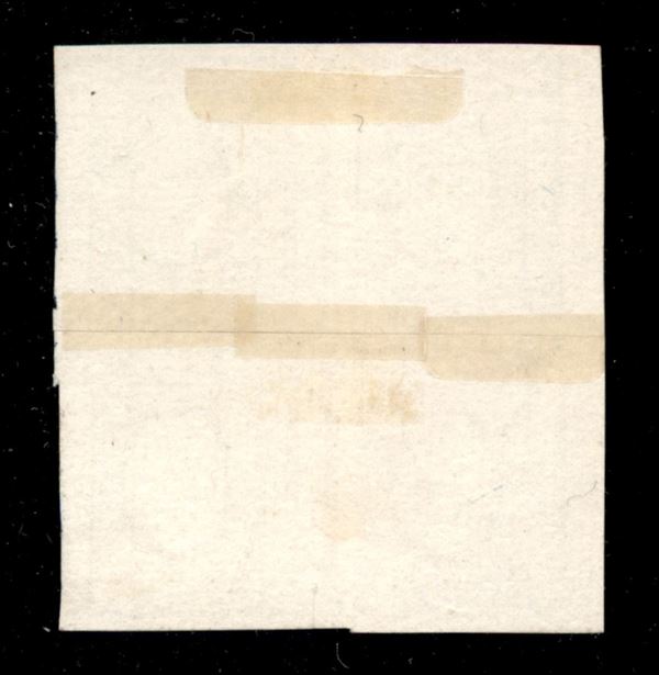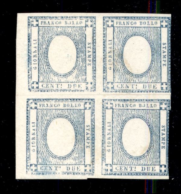 Prova di stampa del c.2 per stampati in colore azzurro su carta spessa, due coppie ricongiunte a quartina come in origine. Raro.