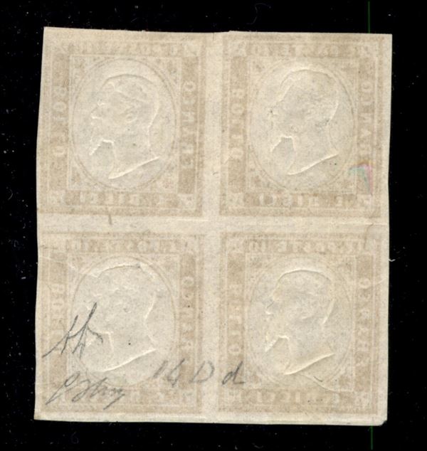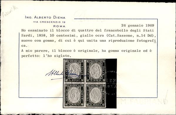 Quartina c.10 giallo ocra (14Dd) nuova con piena gomma originale, cert. A.Diena