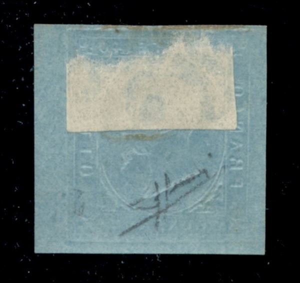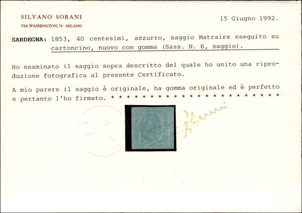 Saggio Matraire c.40 azzurro su carta spessa gommata, ottima qualità e raro, cert. Sorani