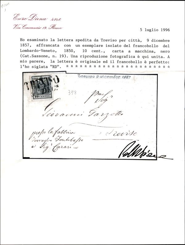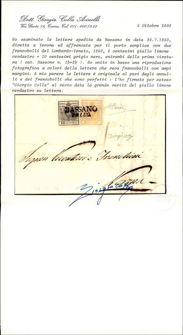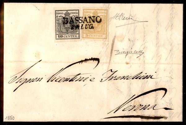 Splendida lettera da Bassano 24.7.50 affrancata con 10 cent grigio nero pił 5 cent giallo limone verdastro (2b + 1b) con ampi margini - bicolore di grande qualitą e raritą - ex coll. Provera - AD + cert. Colla