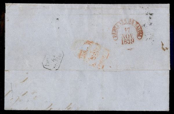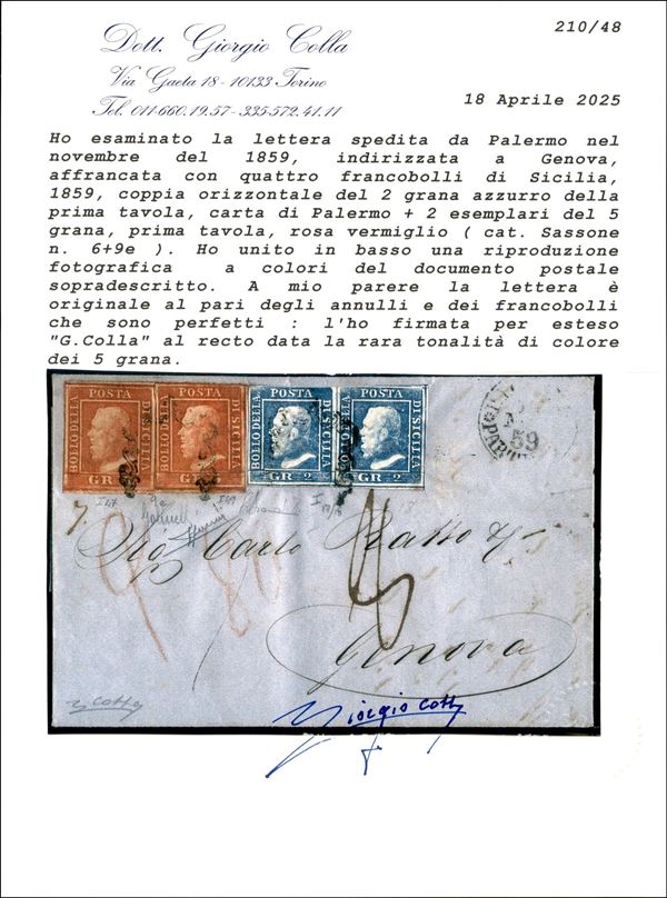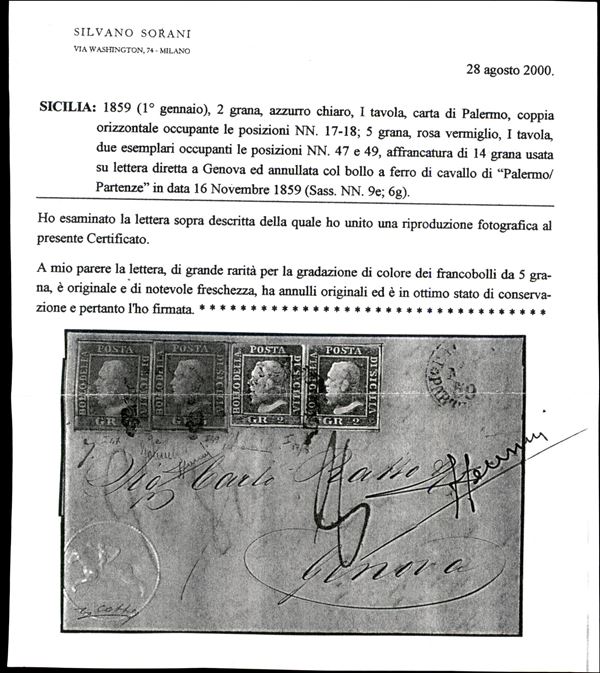 Splendida lettera da Palermo 16.11.59 per Genova affrancata con due esemplari del 5 grana rosa vermiglio (9e - pos. 47 - 49) pił coppia del 2 grana azzurro chiaro (6g - pos. 17/8) - ottimi margini e di grande freschezza - raritą - cert. Sorani (copia) + cert. Colla