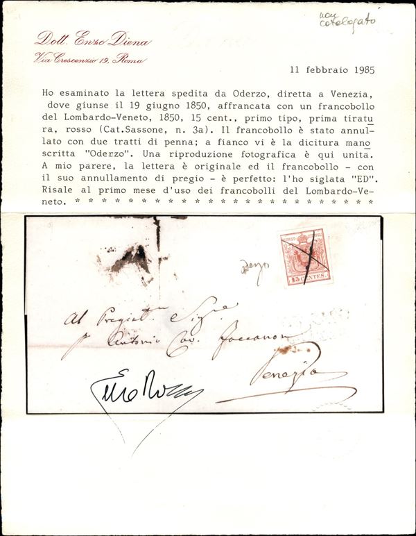 Splendida lettera del 19.6.50 affrancata con 15 cent prima tiratura (3a) con ottimi margini - annullato con due tratti di penna a croce pił Oderzo manoscritto a lato (P.ti R1) - insieme unico - Sottoriva + cert. ED
