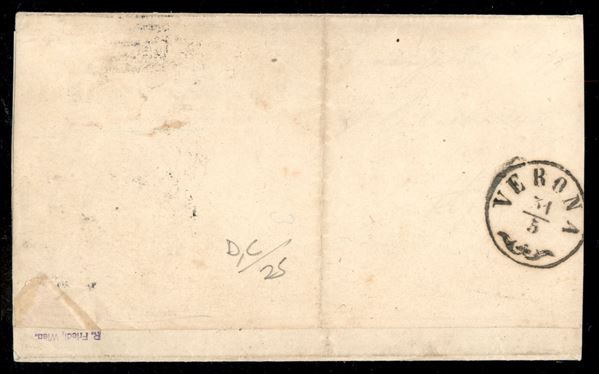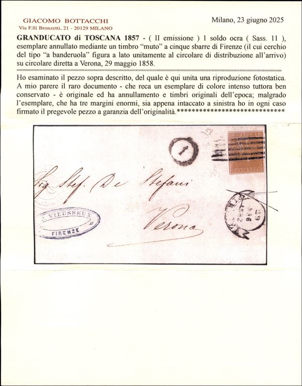 Stampato affrancato con s.1 ocra (11) con tre grandi margini, annullato col muto a cinque sbarre da FIRENZE 29 MAG.1858 per Verona con bollo 1 di distribuzione sul fronte, raro esemplare su lettera, insieme di ottimo aspetto.