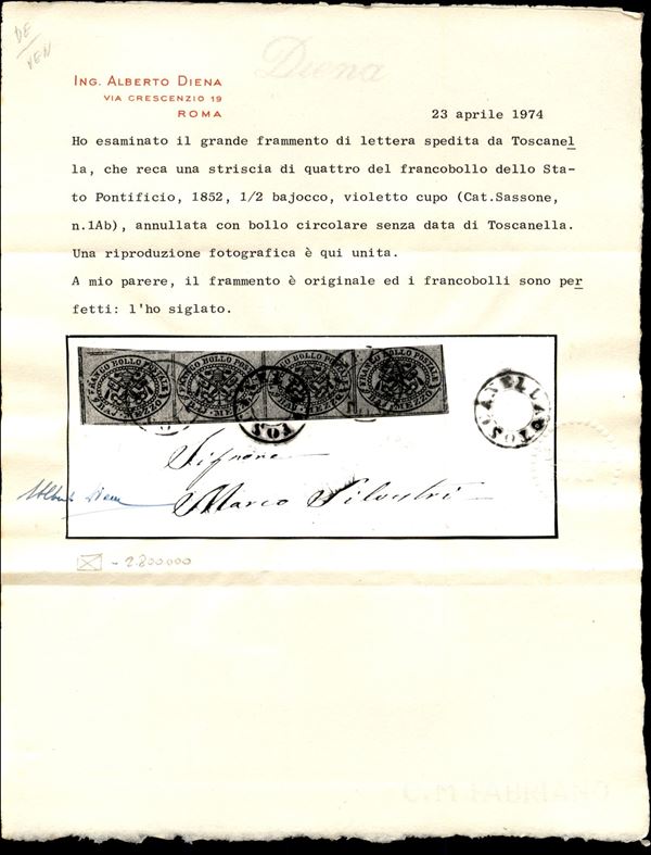 Striscia di quattro del 1/2 baj violetto cupo (1Ab) su frontespizio di lettera da Toscanella - margini corti su 3 esemplari - cert. A. Diena
