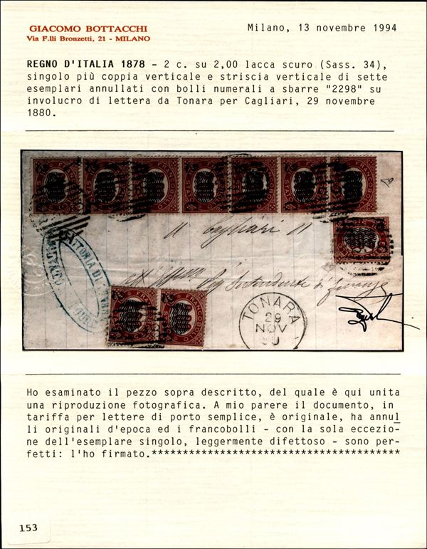 Striscia di sette + coppia + singolo del 2 cent su 2 lire lacca scuro (34) su piego in tariffa da Tonara a Cagliari del 29.11.80 - tutti perfetti ad eccezione dell'esemplare singolo che presenta una leggera piega - ED + cert. Bottacchi