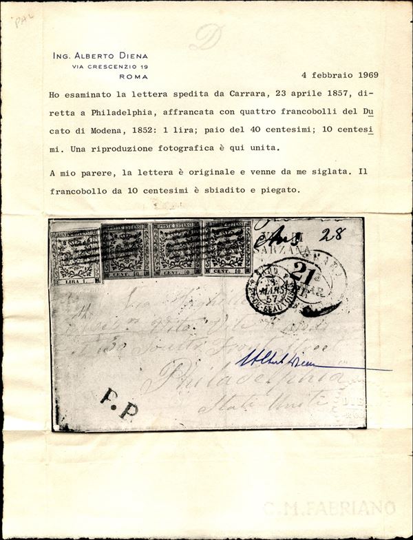 Tricolore composta da 10 cent + coppia del 40 cent + 1 lira (2 + 6 + 11) da Carrara per Filadelfia del 23.4.57 - piega sul 10 cent - L. Gazzi + cert. A. Diena