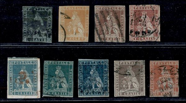 1851/1852 - Lotto di 9 valori della prima emissione escluso il 2 soldi con la crazia ripetuta in colore diverso - il 60 crazie molto fresco di colore con cert. Enzo Diena