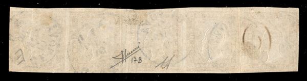 1858 - Striscia orizzontale di cinque del 80 cent giallo arancio chiaro (17B cat.18000) - usata con annullo Genova 12 MAG 60 - cert. Sorani