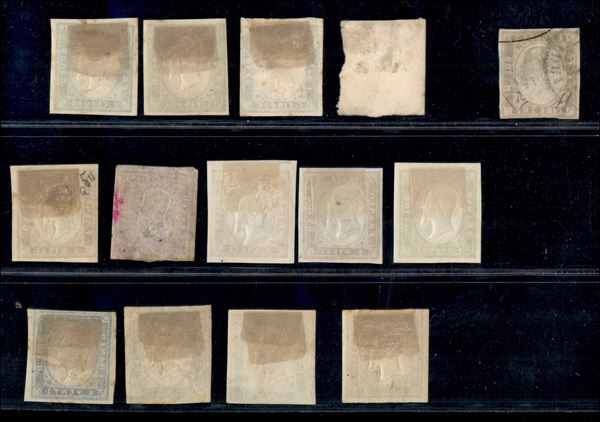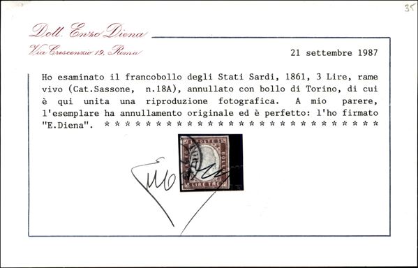 1861 - 3 lire rame (18A) usato con bollo di Torino con cert. Enzo Diena - uniti altri 13 valori dell'emissione sia nuovi che usati