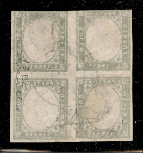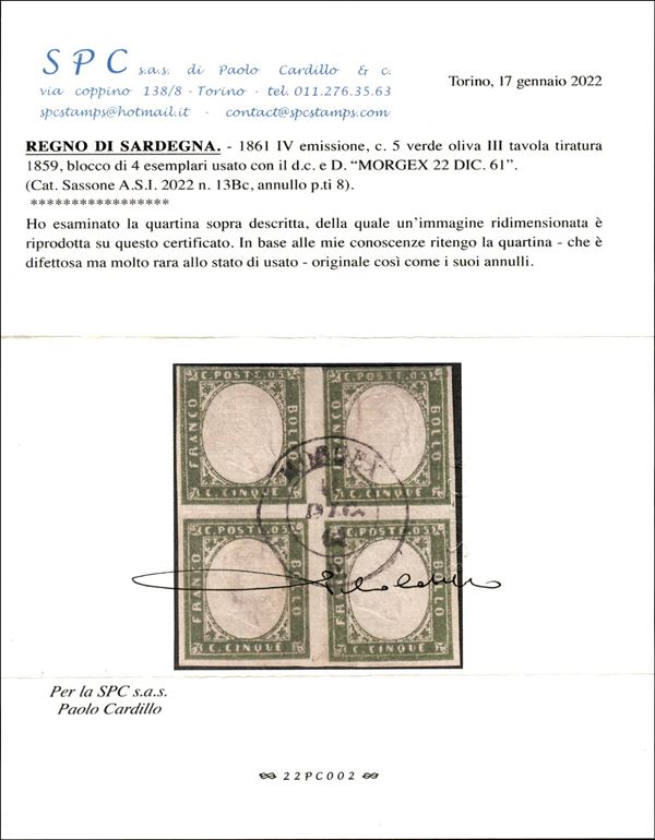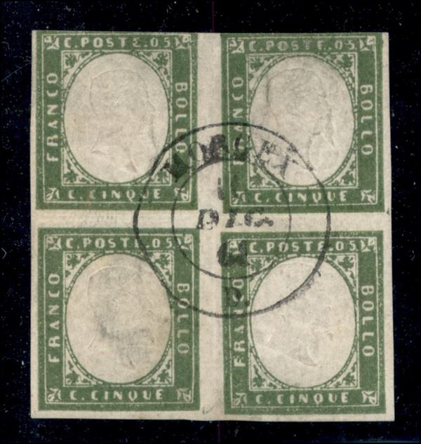 1861 - quartina del 5 cent verde oliva (13Bc cat.16000) usato con annullo Morgex 22 DIC.61 - corta in alto ma molto rara - firme ED + AD + cert. Cardillo