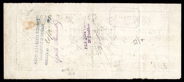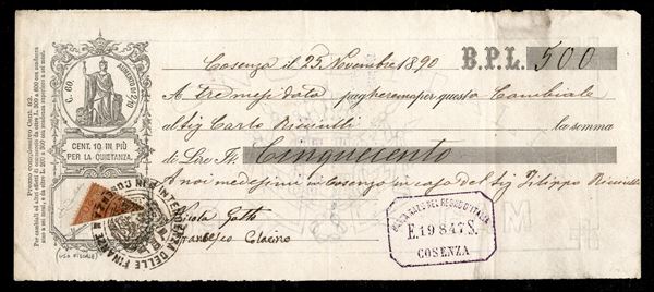 20 cent arancio Umberto I (61) frazionato in diagonale e utilizzato fiscalmente su cambiale del 25 novembre 1890 con annullo amministrativo dell'Intendenza di Finanza di Cosenza - rarità - firme Sorani + Raybaudi