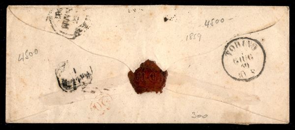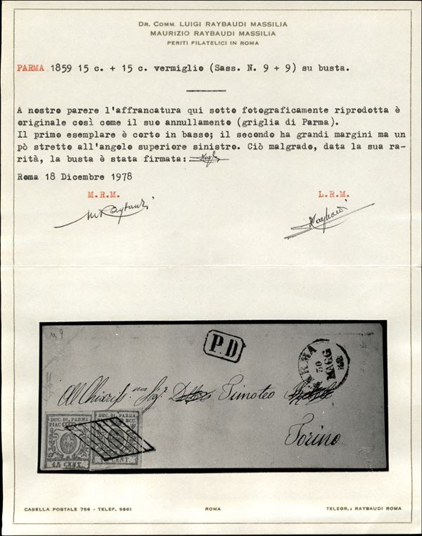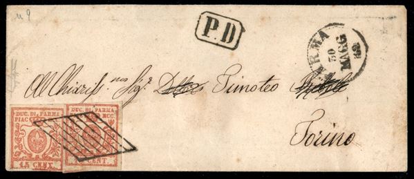 Busta affrancata con due esemplari del 15 cent vermiglio (9) da Parma 30 MAGG 59 per Torino - con annullo a griglietta (P.ti 13) in PD - difetti ma molto fresca - cert. Raybaudi