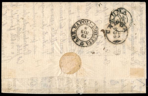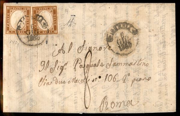 Due esemplari del 10 cent arancio brunastro (14Dg) annullati con bollo borbonico Isernia 6 GIU.1863 su lettera per Roma con tassa pontificia di 8 bajocchi - al verso annullo dell'ambulante Napoli-Isoletta molto bene impresso - firma AD