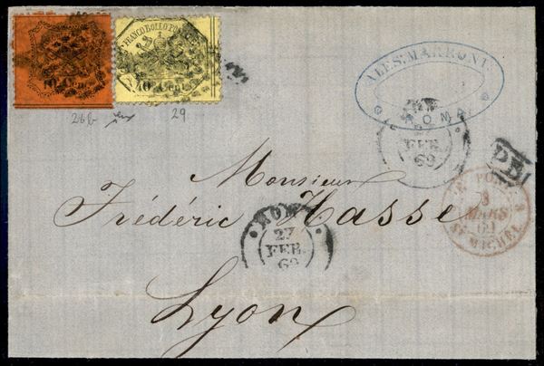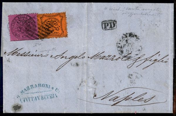 Due lettere con affrancature bicolori - una con 10 cent + 20 cent per Napoli l'altra con 10 cent + 40 cent per la Francia - entrambe con firma Chiavarello