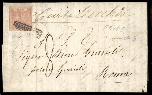 Frode postale - Modulo affrancato con esemplare del 1 grana (3) anziché 5 grana (tariffa corretta) da Napoli a Roma del 22.11.58 - Chiavarello