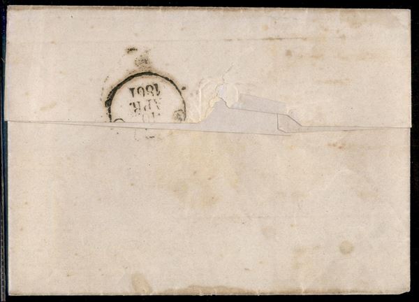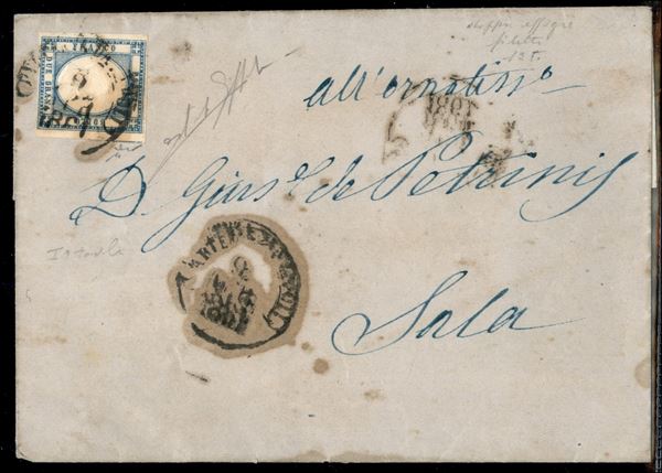 Lettera affrancata con 2 grana azzurro chiaro con filetto di inquadratura in alto (20k cat.1500) annullato Partenza da Napoli 2 GIU.1861 per Sala - firma Chiavarello