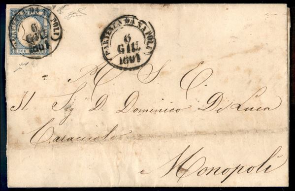 Lettera affrancata con 2 grana azzurro chiaro con filetto di inquadratura in alto (20k cat.1500) annullato Partenza da Napoli 6 GIU.1861 per Monopoli - firma Chiavarello