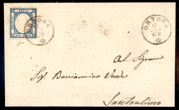 Lettera affrancata con 2 grana azzurro scuro da Ortona 17 GEN 62 (20d + P.ti 6 cat.425) per S. Antimo - firma Chiavarello