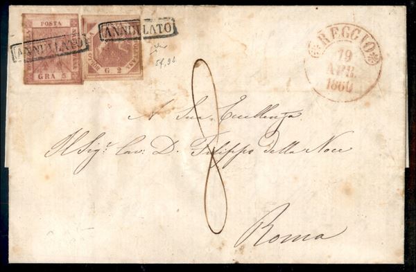 Lettera affrancata con 2 grana carminio I tavola + 5 grana carminio scuro II tavola (5e + 9b) da Reggio 19 APR.1860 per Roma - tassata 8 bajocchi per il percorso pontificio