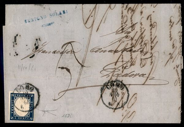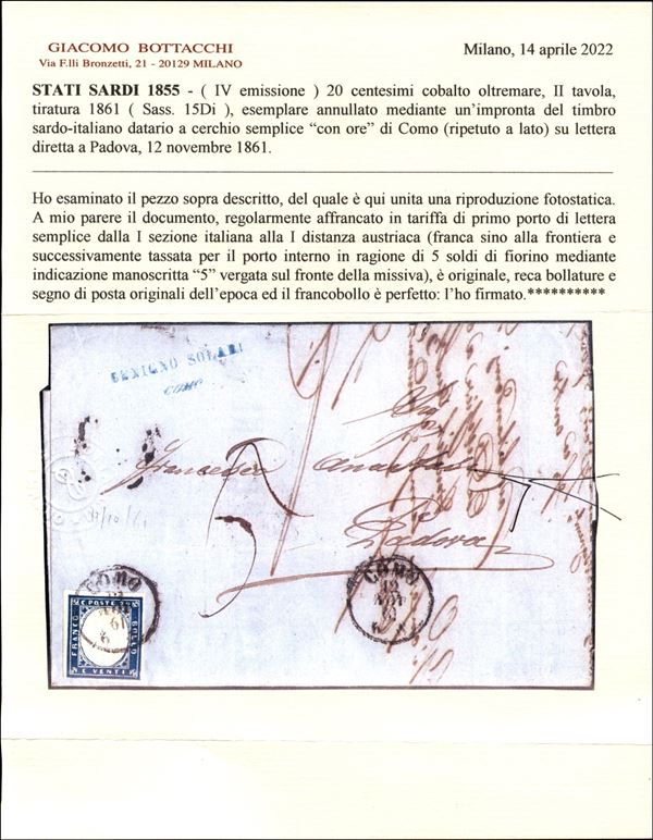 Lettera affrancata con 20 cent cobalto oltremare (15Di cat.3500) con ottimi margini da Como 12 NOV 61 per Padova - tassa "5" per il porto interno austriaco - cert. Bottacchi