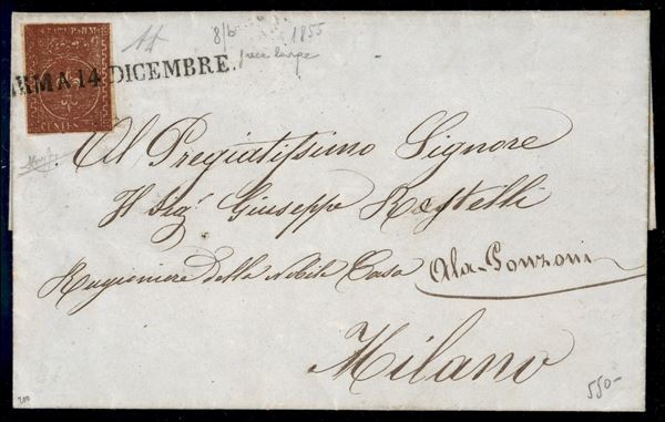 Lettera affrancata con 25 cent bruno rosso (8) da Parma 14 Dicembre del 1855 per Milano - cert. Raybaudi