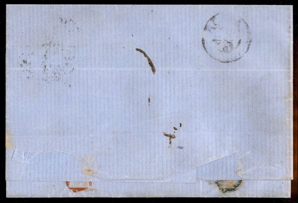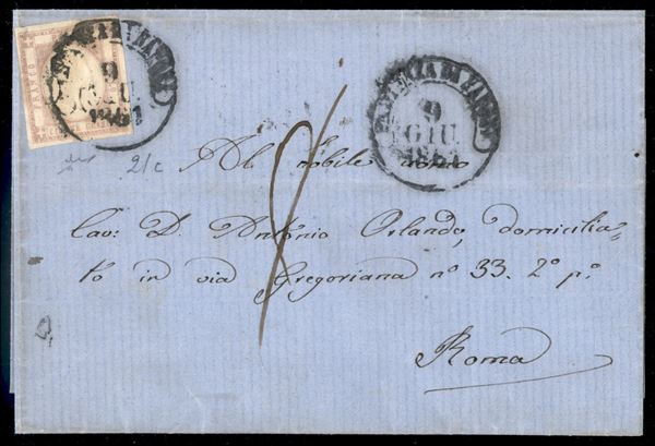 Lettera affrancata con 5 grana lilla (21c cat.2250) annullato Partenza da Napoli 9 GIU.1861 per Roma con tassa 8 manoscritta - firma Chiavarello