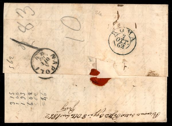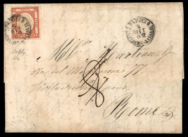 Lettera affrancata con 5 grana vermiglio da Napoli succursale a Chiaia 5 OTT 62 (21a P.ti7 cat.1575) per Roma con tassa 8 manoscritta - periodo tolleranza - firma Colla