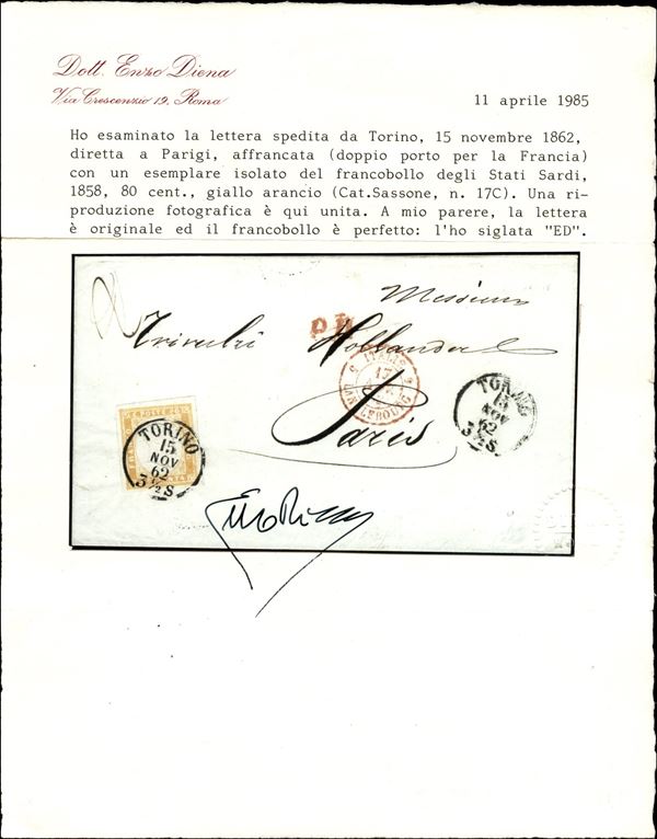 Lettera affrancata con 80 cent giallo arancio (17C cat.6375) isolato da Torino 15 NOV 62 per Parigi - cert. Enzo Diena