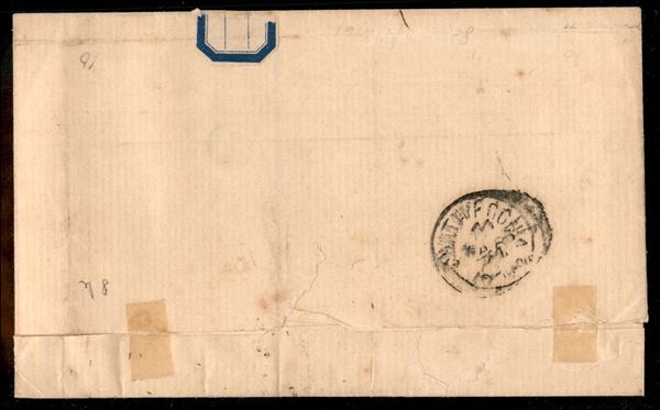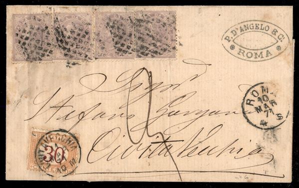 Lettera affrancata con cinque esemplari del 5 cent violetto Marca da Bollo annullati con il muto a rombi da Roma 10 MAR 71 per Civitavecchia - tassata con 30 cent segnatasse - rara