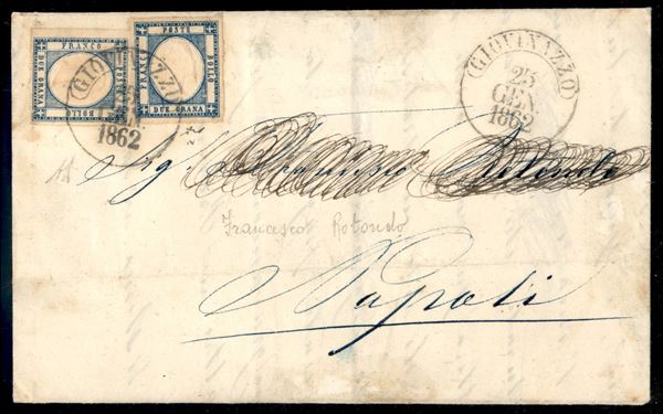 Lettera affrancata con due esemplari del 2 grana azzurro scuro da Giovinazzo 25 GEN.1862 (20d) per Napoli - firme Chiavarello + AD