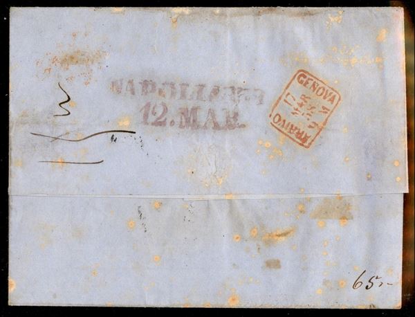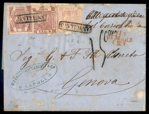 Lettera con affrancatura tricolore composta da 1 grano rosa chiaro + 5 grana rosa brunastro con doppia incisione completa + 10 grana rosa brunastro (3 + 8 + 10) da Napoli 12 MAR.58 con a lato il bollo rosso su tre righe "Via di Mare (E)" diretta a Genova e tassata a tampone 15 centesimi - firma Chiavarello