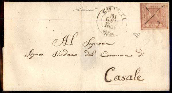 Lettera da CHIETI 31 GEN. 1858 a Casale (ora Casaleincontrada) affrancata in tariffa per il circondario con 1 gr. rosa 1a Tavola (3b) annullato a penna - cert. ED