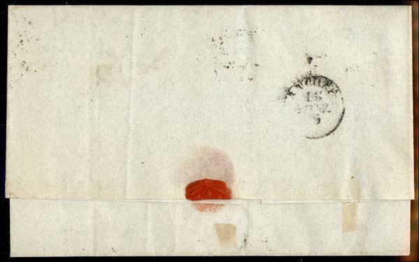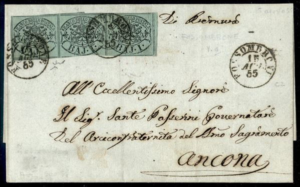 Lettera da Fossombrone 15 AGO. 55 per Ancona affrancata con striscia di tre esemplari 1 baj verde grigiastro (2 cat. 500) - firma Chiavarello