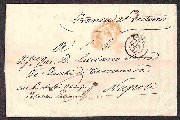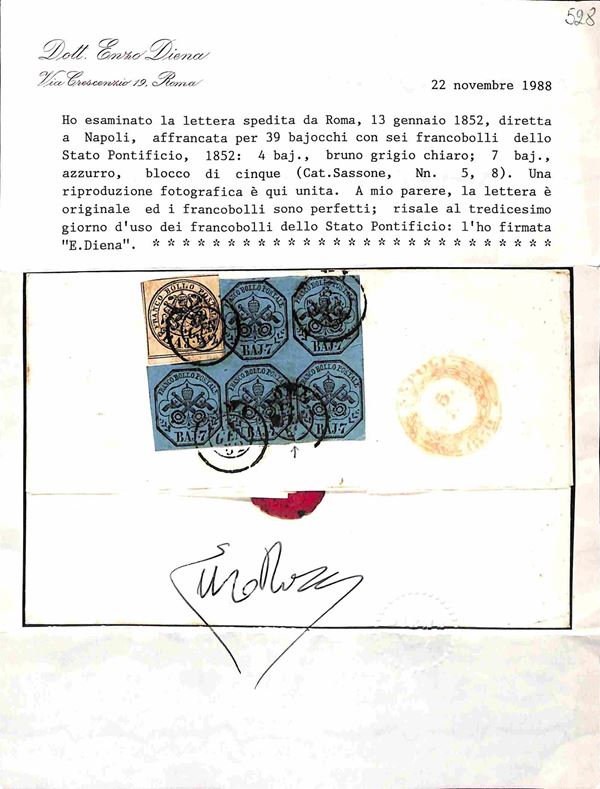 Lettera da Roma 13 GEN. 52 per Napoli affrancata al verso con 4 baj bruno grigio chiaro + blocco di cinque del 7 baj azzurro (5 + 8) franca a destino - cert. Enzo Diena
