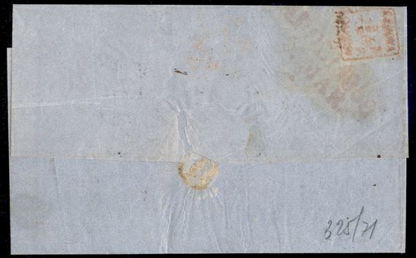 Lettera del 5 marzo 1858 da Vallo per Genova con 1 gr. rosa chiaro + coppia + singolo 5 gr. rosa brunastro - a lato manoscritto "per favore col primo vapore" - la coppia del 5 grana presenta margini eccezionali altri valori con difetti (3 + 8 cat. 3.675) - firma Raybaudi