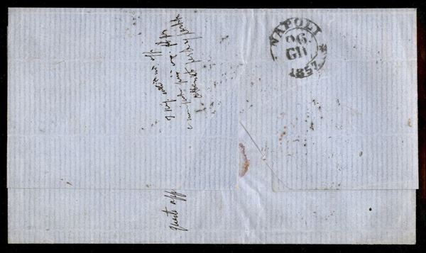 Lettera via di mare affrancata con 20 cent azzurro oltremare scuro + striscia verticale di tre 40 cent vermiglio (15Aa + 16 cat.13000+) da Genova 23 GIU 57 per Napoli con tassa di 33 grana per l'inoltro a destino