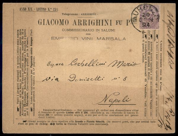 Listino affrancato per triplo porto con 60 cent violetto Umberto (47 cat.950) da Auronzo 20 GEN 94 per Napoli - insieme molto interessante