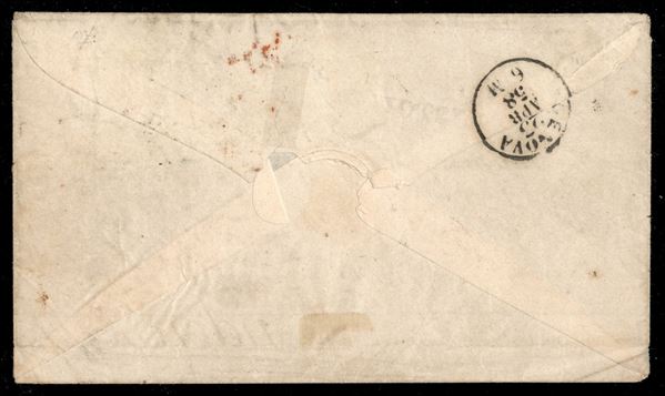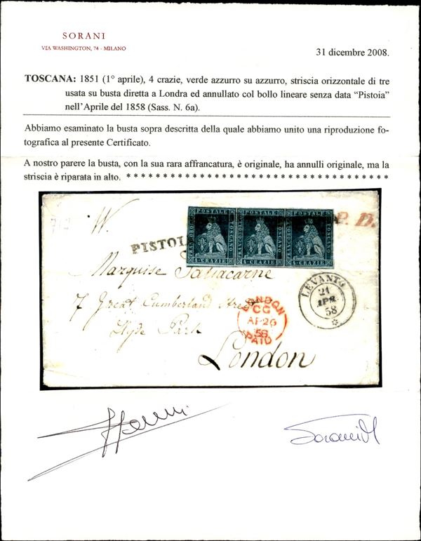 Pistoia (p.ti 11) ripetuto tre volte su striscia orizzontale di tre del 4 crazie verde azzurro su azzurro (6a) con ottimi margini in ogni lato (riparata orizzontalmente in alto) - bustina per Londra via Levanto 21 APR.58 e Genova 23 APR 58 - da esaminare - cert. Sorani