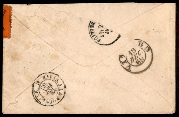 Sei esemplari del 10 cent arancio vermiglio due coppie + due singoli (26) su bustina per la Francia da Viterbo 19 dicembre 1869 a Poitiers - firma Chiavarello