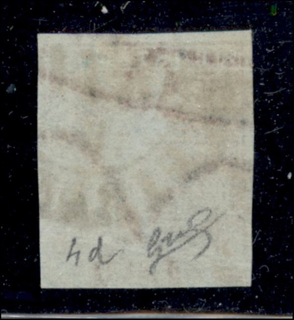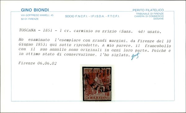 1851 - Bell'esemplare del 1 crazia carminio su grigio (4d - Pos. 52) con ornato superiore sinistro interrotto più coda unita alla linea di riquadro e T di Toscana con baffo - usato - molto bello - cert. Biondi