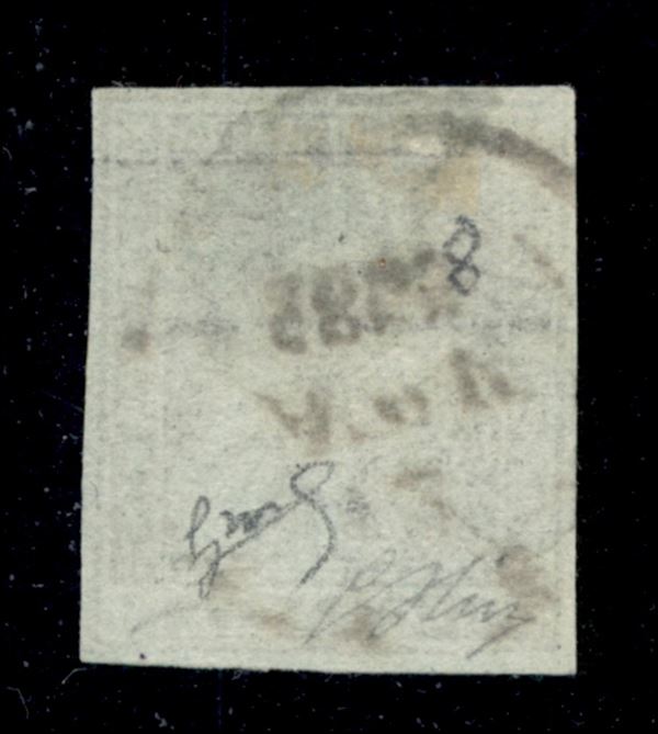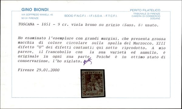 1851 - Bellissimo esemplare con grandi margini del 9 crazie viola bruno su grigio (8) con macchia sul corpo del leone - usato - cert. Biondi