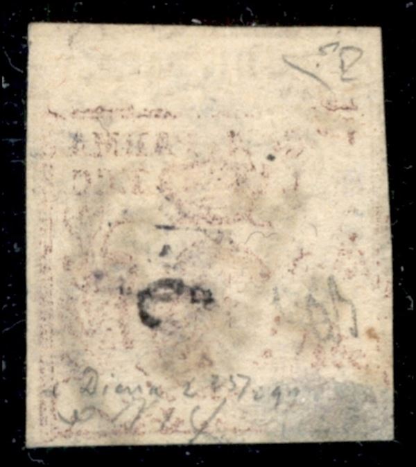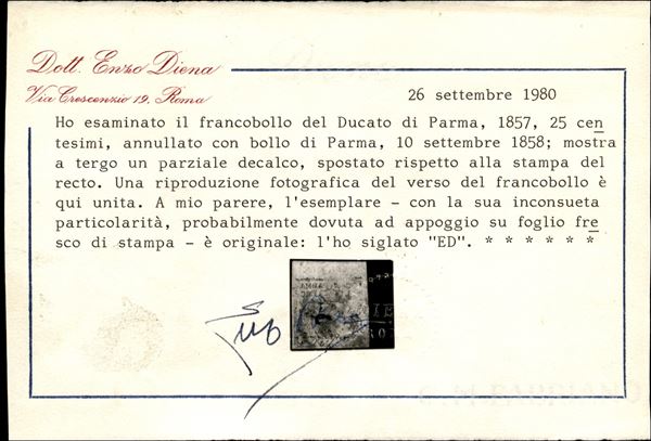 1857 - 25 cent bruno lilla (10) usato con decalco - cert. E. Diena
