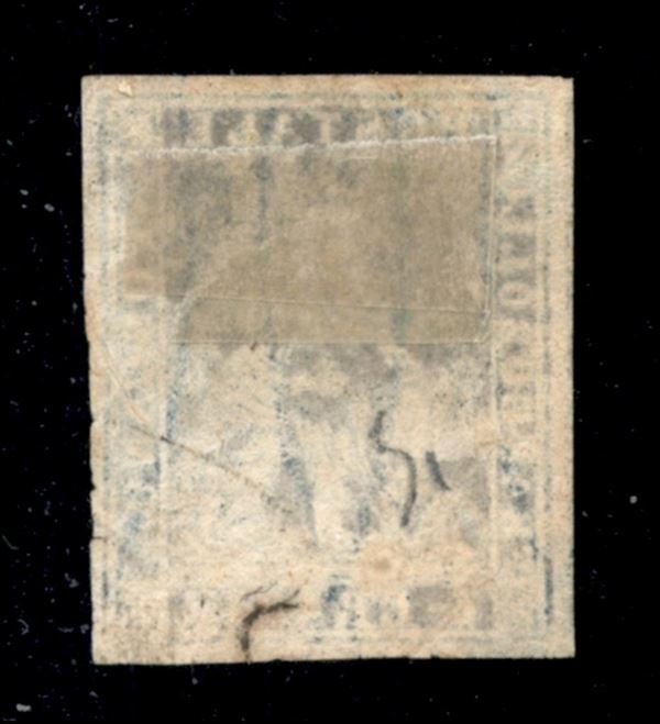 1857 - Bellissimo esemplare del 4 crazie azzurro cupo (15b) con grande macchia sul corpo del leone - usato - inizio di decalco al retro - molto bello