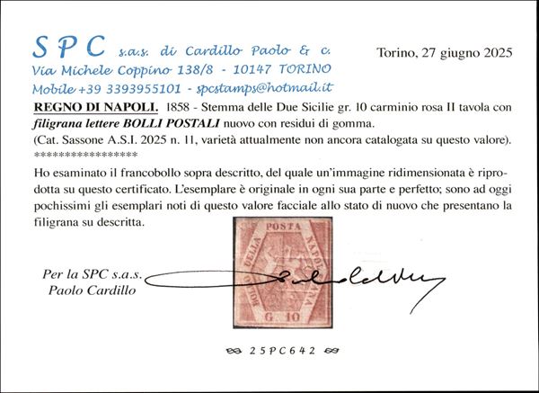 1858 - 10 grana carminio rosa II tavola (11) con filigrana lettere BOLLI POSTALE - nuovo con gomma parziale - varietà attualmente non ancora catalogata su questo valore - Cert. Cardillo