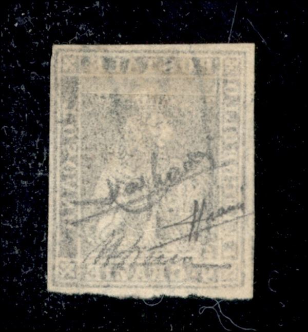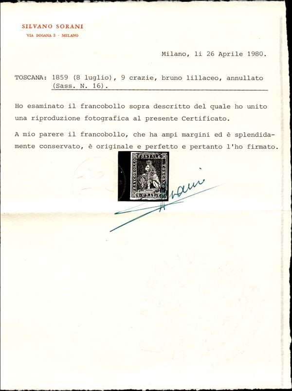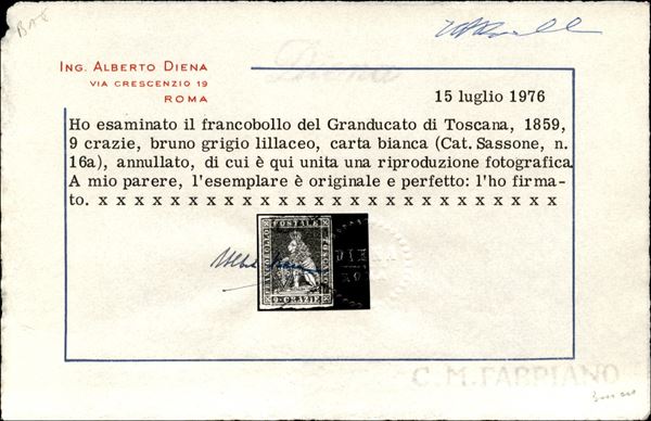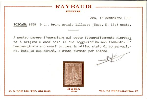 1859 - 9 crazie bruno grigio lillaceo (16a) con leggero annullo - ben marginato - cert. A. Diena + cert. Sorani + cert. Raybaudi