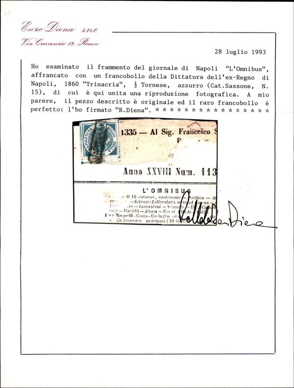 1860 - Trinacria 1/2 Tornese azzurro (15) su frammento di giornale di Napoli "L'Omnibus" - ottimi margini e molto bello - molto raro - Cert. E. Diena