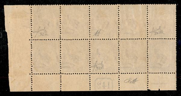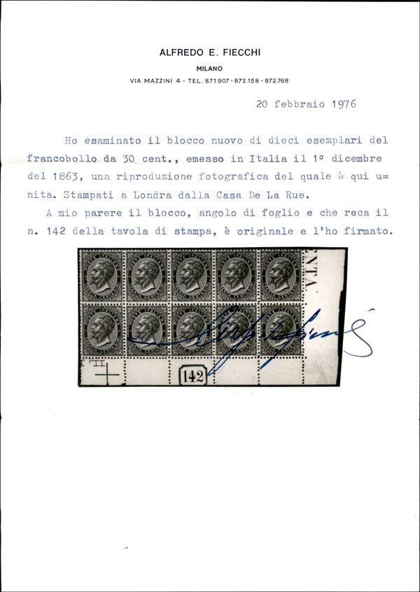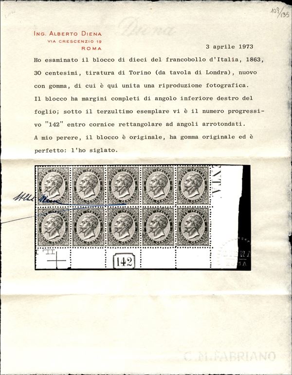 1866 - Blocco di dieci angolo di foglio del 30 cent bruno (T19) con numero di Tavola 142 in rettangolo - gomma integra - cert. A. Diena + cert. Fiecchi
